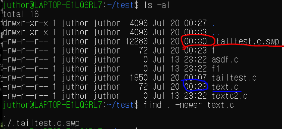 | find . -newer [파일 이름] | -newer 옵션 뒤에 적힌 파일보다 최근에 변경된 파일![]() |
