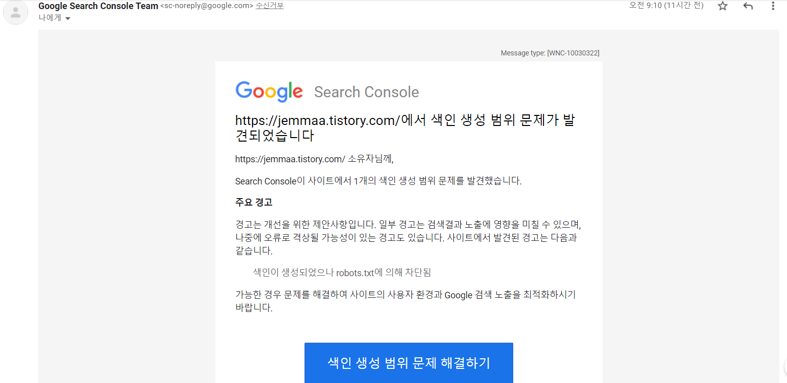 메일 하단에 파란 박스로 색인 범위 문제 해결하기를 눌러서 들어갔더니,