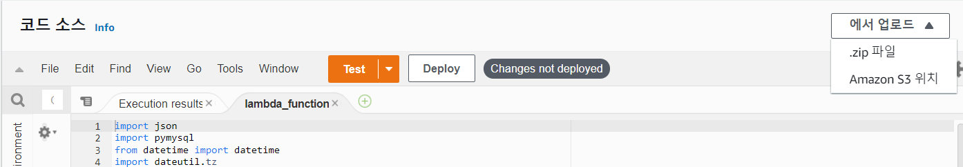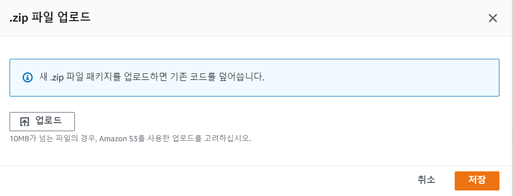 주의!!! zip파일을 업로드 한다면 기존 작성한 lambda함수 전체를 날리고 이 zip파일로 덮어쓴다는 것이기에 제발 유의하시길 바란다. (나는 1주일간 작성한 코드를 날려먹었다..)