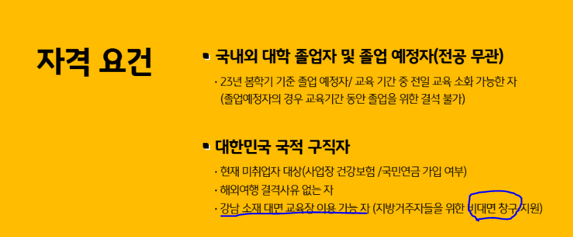 - 강남 소재 대면 교육장 이용 가능자 (지방거주자들을 위한 비대면 창구 지원)