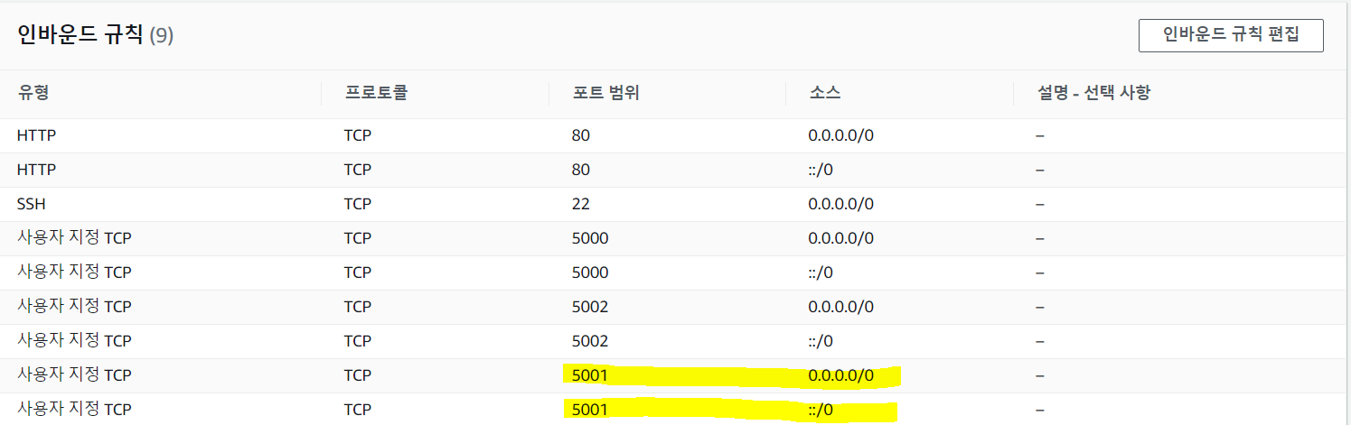 첫번째로 확인해야할 것은 AWS EC2에서 인바운드 규칙에서 해당 port를 열었는지 확인해야할 것이다.