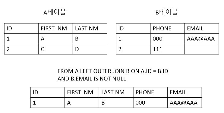 예를 들면 A, B테이블이 있고 A테이블 기준 B테이블을 LEFT OUTER JOIN한다면