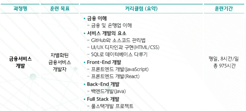 - 국비과정인데 4대 은행 중 하나은행이 진행하는 것이다 보니 금융 및 은행업 관련해서 교육을 진행한다고 한다.